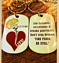 Engraving on back says: Life! happens; sometimes it breaks your heart. Don't stay broken. "FIND PEACE; BE STILL."