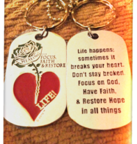 Engraving on back says: Life! happens; sometimes it breaks your heart. Don't stay broken. Focus on God, Have Faith & Restore Hope in all things
